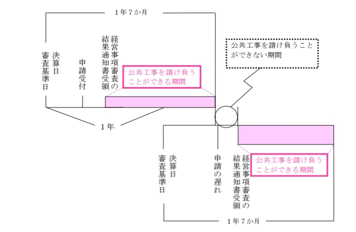 前年度に経営事項審査を受けていても、次の年度に申請するのが遅くなると、前年度の経営事項審査の有効期間が経過するまでに次の年度の経営事項審査の結果通知書を受領することができません。この場合、有効な経審結果を有しないことから公共工事の発注者と請負契約を締結することができなくなります。